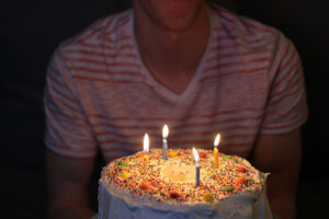 In many parts of the world an individual’s birthday is celebrated by a party where a specially made cake, usually decorated with lettering and the person’s age, is presented. The cake is traditionally studded with the same number of lit candles as the age of the individual, or a number candle representing their age. The celebrated individual will usually make a silent wish and attempt to blow out the candles in one breath; if successful, a tradition holds that the wish will be granted.